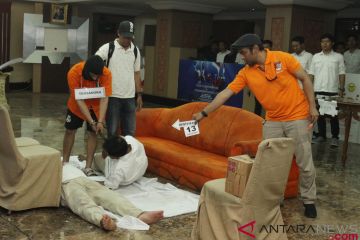 Tersangka HS melakukan reka ulang kejadian saat prarekonstruksi kasus pembunuhan satu keluarga di Polda Metro Jaya, Jakarta, Senin (19/11/2018). Direktorat Reserse Kriminal Umum Polda Metro Jaya melakukan prarekonstruksi tersebut dengan menghadirkan tersangka HS melakukan 35 adegan pembunuhan satu keluarga di Bekasi, Jawa Barat. ANTARA FOTO/Reno Esnir/aww.