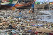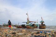 Nelayan menyandarkan perahunya di bibir pantai yang dipenuhi sampah plastik di Desa Dadap, Indramayu, Jawa Barat, Senin (26/11/2018). LSM World Wild Fund for Nature (WWF) Indonesia menilai masalah pencemaran sampah plastik di laut Indonesia sudah bisa disebut sebagai darurat sampah plastik karena perlu penanganan serius. ANTARA FOTO/Dedhez Anggara/aww.