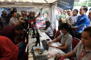 Presiden Joko Widodo (kiri) bersama Menteri Sosial Agus Gumiwang K berbincang dengan siswa penyandang disabilitas asal Sukabumi Mukhlis Abdul Holik (kedua kanan) di sela-sela Peringatan Hari Disabilitas Internasional Tahun 2018 di Bekasi, Jawa Barat, Senin (3/12/2018). Dalam kesempatan tersebut, siswa kelas 3 Sekolah Dasar Negeri (SDN) X Cibadak, Kabupaten Sukabumi, itu menyampaikan keinginannya kepada presiden untuk dapat menempuh pendidikan sampai jenjang kuliah. ANTARA FOTO/Puspa Perwitasari/kye.