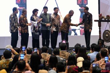 Presiden Joko Widodo (kanan) berjabat tangan dengan Ketua KPK Agus Rahardjo (kedua kanan) disaksikan Menko Polhukam Wiranto (ketiga kanan) serta Wakil Ketua KPK (kiri ke kanan) Saut Situmorang, Alexander Marwata, Basaria Panjaitan dan Laode M Syarif usai meresmikan pembukaan peringatan Hari Anti Korupsi Dunia (Hakordia) 2018 di Jakarta, Selasa (4/12/2018). Peringatan Hakordia 2018 yang diselenggarakan oleh KPK mengagendakan sejumlah kegiatan seperti konferensi pemberantasan korupsi, penandatanganan komitmen partai politik peserta pemilu 2019, lelang barang rampasan dan pameran anti korupsi. ANTARA FOTO/Wahyu Putro A/wsj.