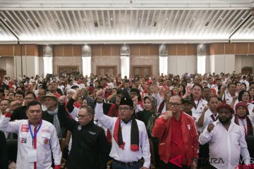 Sekjen PDIP Hasto Kristiyanto memberikan sambutan saat silaturahmi dan rakornas Aliansi Relawan Jokowi (ARJ) di Jakarta, Minggu (9/12/2018). Aliansi Relawan Jokowi menggelar silaturahmi dan rapat koordinasi (Rakornas) dengan tema "Membangun Sinergi Menuju Kemenangan" untuk kemenangan Joko Widodo dan Ma'ruf Amin dalam pemilihan umum presiden 2019. ANTARA FOTO/Galih Pradipta/foc.