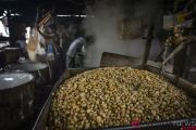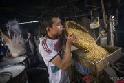 Pekerja menggiling kedelai impor untuk diolah menjadi tahu di Jakarta Selatan, Kamis (3/1/2019). Nilai tukar rupiah yang mengalami deviasi dari Rp13.400 ke Rp14.247 per dolar AS sepanjang tahun 2018, membuat harga bahan baku tahu yakni kedelai impor naik hingga Rp7.500 per kilogram. ANTARA FOTO/Aprillio Akbar/aww.
