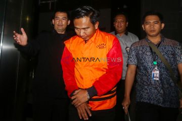 Sekretaris Dinas PUPR Kabupaten Mesuji Wawan Suhendra mengenakan rompi tahanan seusai menjalani pemeriksaan terkait operasi tangkap tangan (OTT) kasus dugaan korupsi Bupati Mesuji di Gedung KPK, Jakarta, Jumat (25/1/2019). KPK menahan lima tersangka terkait kasus dugaan korupsi proyek infrastruktur di Dinas PUPR Kabupaten Mesuji, yakni Bupati Mesuji Khamami dan adiknya Taufik Hidayat, Sekretaris Dinas PUPR Kabupaten Mesuji Wawan Suhendra, pemilik PT Jasa Promix Nusantara dan PT Secilia Putri Sibron Azis serta Kardinal selaku swasta. ANTARA FOTO/Rivan Awal Lingga/wpa/ama.