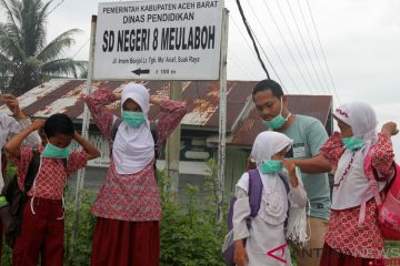 Seorang aktivis memakaikan masker kepada siswa Sekolah Dasar Negeri 8 Meulaboh saat membagikan masker gratis di Desa Suak Raya, Johan Pahlawan, Aceh Barat, Aceh, Kamis (31/1/2019). Pembagian masker gratis tersebut dilakukan untuk mengantisipasi terserangnnya penyakit Infeksi Saluran Pernafasan Akut (ISPA) mengingat kabut asap semakin tebal akibat kebakaran lahan gambut di Kabupaten setempat. ANTARA FOTO/Syifa Yulinnas/hp.
