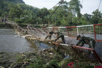 Anggota TNI membersihkan sampah yang tersangkut di jembatan Kalijogo, Dusun Karang Wetan, Tegaltirto, Berbah, Sleman, DI Yogyakarta, Kamis (31/1/2019). Jembatan gantung penghubung dua desa yang baru selesai dibangun tersebut rusak akibat timbunan sampah yang terbawa arus banjir sungai Opak. ANTARA FOTO/Hendra Nurdiyansyah/hp.