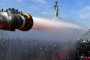 Prajurit TNI AL berusaha menghalau serangan warga yang berunjuk rasa saat simulasi Pengamanan Pemilu Legislatif dan Pemilihan Presiden 2019 di Dermaga Madura, Mako Koarmada II, Ujung, Surbaya, Jawa Timur, Senin (4/2/2019). Simulasi tersebut untuk meningkatkan kesiapan TNI AL dalam menghadapi segala bentuk ancaman dan gangguan saat Pemilu 2019. ANTARA FOTO/Zabur Karuru/hp.