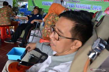 Warga mengikuti donor darah yang digelar Persatuan Wartawan Indonesia (PWI) Jombang, Jawa Timur, Jumat (8/2/2019). Bakti sosial donor darah tersebut merupakan rangkaian peringatan Hari Pers Nasional 2019 di Jombang. ANTARA FOTO/Syaiful Arif/hp.
