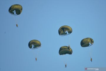 Prajurit Paskhas TNI AU terjun dari pesawat Herculues A-1318 saat Latihan Terjun Penyegaran (Junggar) di Pangkalan Udara Sultan Iskandar Muda, Aceh Besar, Aceh, Jumat (8/2/2019). Latihan Terjun Penyegaran dan dilanjutkan Terjun Free Fall itu melibatkan sebanyak 105 prajurit untuk meningkatkan kemampuan dan profesionalisme TNI AU. ANTARA FOTO/Ampelsa/hp.