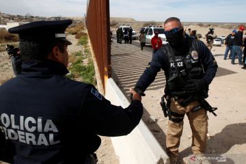 Polisi Amerika dan Meksiko berjabat tangan saat mengamankan aksi warga Amerika Serikat mendukung pembangunan tembok perbatasan Meksiko di Ciudad Juarez, Meksiko, Sabtu (9/2/2019). ANTARA FOTO/REUTERS/Jose Luis Gonzalez/pras.