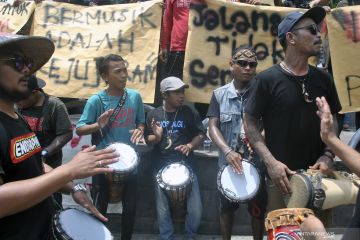 Komunitas musisi jalanan melakukan aksi unjuk rasa menolak RUU Permusikan di Tepas Lawang Salapan, Kota Bogor, Jawa Barat, Minggu (10/2/2019). Dalam aksinya mereka menolak RUU Permusikan karena akan membelenggu kebebasan berekspresi serta membatasi kreativitas musisi untuk berkarya. ANTARA FOTO/Arif Firmansyah/pras.