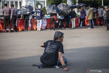 Aktivis Jaringan Solidaritas Korban untuk Keadilan (JSKK) menggelar aksi Kamisan ke-574 di depan Istana Merdeka, Jakarta, Kamis (14/2/2019). Dalam aksinya mereka menolak pengesahan Rancangan Undang-Undang (RUU) Permusikan karena dapat membatasi kebebasan berekspresi dan berpendapat. ANTARA FOTO/Aprillio Akbar/hp.