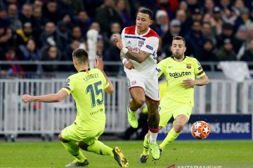 Pemain Lyon Memphis Depay (tengah) berusaha melewati hadangan pemain Barcelona Clement Lenglet dan Jordi Alba dalam laga leg pertama babak 16 besar Liga Champions, di Stadion Groupama, Lyon, Perancis, Selasa (19/2/2019). Pertandingan ini berakhir imbang 0-0. ANTARA FOTO/Reuters-Emmanuel Foudrot/hp.