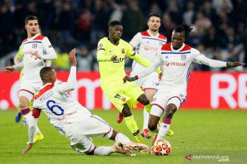 Pemain Barcelona Ousmane Dembele (tengah) berebut bola dengan pemain Lyon Bertrand Traore dan Marcelo dalam laga leg pertama babak 16 besar Liga Champions, di Stadion Groupama, Lyon, Perancis, Selasa (19/2/2019). Pertandingan ini berakhir imbang 0-0. ANTARA FOTO/Reuters-Emmanuel Foudrot/hp.
