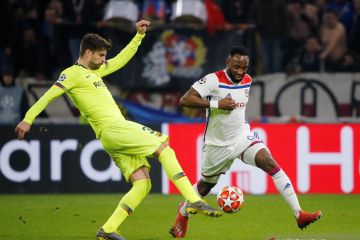 Pemain Barcelona Gerard Pique (kiri) berebut bola dengan pemain Lyon Moussa Dembele dalam laga leg pertama babak 16 besar Liga Champions, di Stadion Groupama, Lyon, Perancis, Selasa (19/2/2019). Pertandingan ini berakhir imbang 0-0. ANTARA FOTO/Reuters-Paul Pelissier/hp.
