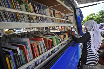 Seorang anak membaca buku di mobil Perpustakaan Keliling di area Car Free Day (CFD) Alun-alun Serang, Banten, Minggu (24/2/2019). Pemerintah Indonesia terus menggalakan pengadaan perpustakaan keliling dan taman-taman bacaan masyarakat (TBM) untuk meningkatkan minat baca masyarakat Indonesia yang menurut hasil studi WMLN (World's Most Literate Nations) tahun 2018 ada pada peringkat 59 dari 61 negara dengan skor satu berbanding sepuluh ribu orang atau 0,01%. ANTARA FOTO/Asep Fathulrahman/ama.