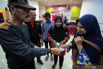 Petugas menyerahkan Kartu Tanda Penduduk elektronik (e-KTP) secara simbolis kepada warga saat berlangsung perekaman e-KTP massal Gerakan Indonesia Sadar Adminitrasi Kependudukan (GISA) di Gor Unimal Cunda, Lhokseumawe, Aceh, Kamis (7/3/2019). Kementerian Dalam Negeri RI melalui Dinas Registrasi Kependudukan Aceh (DRKA) dan Disdukcapil kabupaten/kota melakukan perekaman data dan percetakan e-KTP secara massal untuk mengejar 16 ribu lebih masyarakat Kabupaten Aceh Utara dan Kota Lhokseumawe belum membuat e-KTP hingga menjelang Pemilu 2019. ANTARA FOTO/Rahmad/hp.
