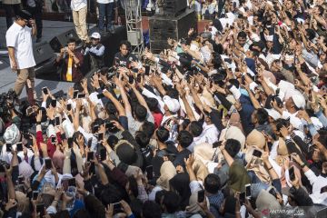 Calon Presiden nomor urut 02 Prabowo Subianto (ketiga kiri) menari disaksikan penyanyi Nissa Sabyan (keempat kiri) saat menyapa pendukung sebelum menghadiri kuliah umum di Kampus Universitas Kebangsaan Republik Indonesia (UKRI), Bandung, Jawa Barat, Jumat (8/3/2019). Prabowo akan menyampaikan kuliah umum bertajuk Renaisans Indonesia. ANTARA FOTO/M Agung Rajasa/hp.