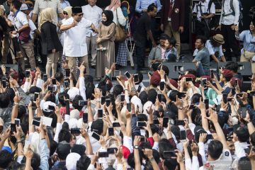 Calon Presiden nomor urut 02 Prabowo Subianto menyapa pendukungnya sebelum menghadiri kuliah umum di Kampus Universitas Kebangsaan Republik Indonesia (UKRI), Bandung, Jawa Barat, Jumat (8/3/2019). Prabowo akan menyampaikan kuliah umum bertajuk Renaisans Indonesia. ANTARA FOTO/M Agung Rajasa/hp.