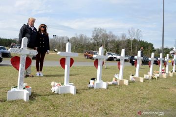 Presiden Amerika Serikat Donald Trump (kiri) dan Ibu Negara Melania Trump (kanan) mengheningkan cipta di depan nisan korban meninggal dunia saat mengunjungi lokasi terdampak angin tornado di Beauregard, Alabama, Amerika Serikat, Jumat (8/3/2019). ANTARA FOTO/REUTERS/Mike Theiler/wsj.