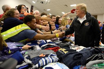Presiden Amerika Serikat Donald Trump (kanan) menyapa relawan yang telah membantu mengelola bantuan pakaian di Gereja Providence Baptist saat mengunjungi lokasi terdampak angin tornado di Beauregard, Alabama, Amerika Serikat, Jumat (8/3/2019). ANTARA FOTO/REUTERS/Mike Theiler/wsj.