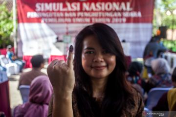 Warga menunjukkan jari yang telah dicelupkan ke dalam tinta usai menggunakan hak suaranya saat acara Simulasi Nasional Pemungutan dan Perhitungan Suara Pemilu 2019 di area wisata Goa Selarong, Bantul, DI Yogyakarta, Sabtu (9/3/2019). Acara yang digagas oleh KPU pusat itu digelar untuk memberikan edukasi kepada masyarakat tentang proses pemungutan dan penghitungan suara pemilihan umum serentak yang akan dilaksanakan pada 17 April 2019 mendatang. ANTARA FOTO/Andreas Fitri Atmoko/wsj.