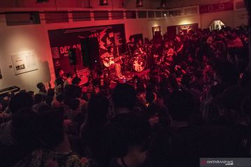 Grup band Zigi Zaga beraksi dalam pertunjukan musik bertajuk Del Aje RUU Permusikan di Galeri Foto Jurnalistik Antara (GFJA), Pasar Baru, Jakarta, Sabtu (9/3/2019). Acara pertunjukan musik tersebut dalam rangka memperingati Hari Musik Nasional dan mengenang 116 tahun komponis sekaligus wartawan WR Soepratman. ANTARA FOTO/Aprillio Akbar/aww.