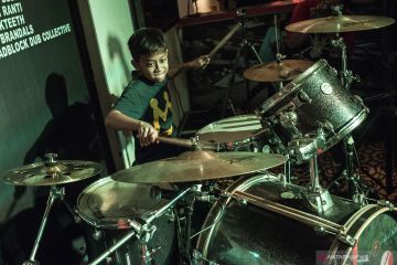 Drummer Norifumi Mikail beraksi dalam pertunjukan musik bertajuk Del Aje RUU Permusikan di Galeri Foto Jurnalistik Antara (GFJA), Pasar Baru, Jakarta, Sabtu (9/3/2019). Acara pertunjukan musik tersebut dalam rangka memperingati Hari Musik Nasional dan mengenang 116 tahun komponis sekaligus wartawan WR Soepratman. ANTARA FOTO/Aprillio Akbar/aww.