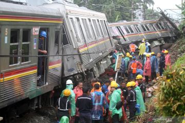 EVAKUASI KECELAKAAN KRL COMMUTER LINE. Petugas KAI mengevakuasi gerbong KRL Commuter Line 1722 yang anjlok di pintu perlintasan Kebon Pedes, Tanah Sareal, Kota Bogor, Jawa Barat, Minggu (10/3/2019). Proses evakuasi garbong kereta diprediksi selesai hingga besok pagi dan dapat kembali dilalui oleh KRL. ANTARA FOTO/Yulius Satria Wijaya/foc.ANTARA FOTO/Yulius Satria Wijaya (ANTARA FOTO/Yulius Satria Wijaya)