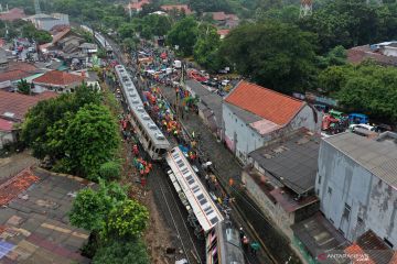 Foto udara proses evakuasi KRL Commuter Line 1722 yang anjlok di pintu perlintasan Kebon Pedes, Tanah Sareal, Kota Bogor, Jawa Barat, Minggu (10/3/2019). ANTARA FOTO/Wahyu Putro A/foc.