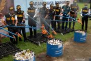 Menteri Pertanian Andi Amran Sulaiman (ketiga kiri) bersama Direktur Jenderal Bea Cukai Heru Pambudi (keempat kiri), Gubernur Sulsel Nurdin Abdullah (kedua kiri), Kepala Kantor Wilayah Direktorat Jenderal Bea Cukai Sulsel Padmoyo Tri Wikanto (tengah) dan Wali Kota Makassar Mohammad Ramdhan Pomanto (kiri) membakar sejumlah barang bukti minuman keras dan rokok ilegal hasil penindakan di Makassar, Sulawesi Selatan, Rabu (13/3/2019). Barang bukti hasil penindakan sepanjang tahun 2018 dan awal 2019 yang dimusnahkan tersebut diantaranya berupa minuman keras ilegal sebanyak 552 botol dan 12 juta batang rokok ilegal dengan nilai barang diperkirakan mencapai Rp9,29 miliar dengan potensi kerugian negara senilai Rp4,2 miliar. ANTARA FOTO/Abriawan Abhe/foc.