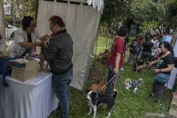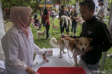 Warga berkonsultasi dengan dokter untuk kesehatan hewan piaraan saat Kegiatan kegiatan vaksin Pet Healthy Day di Pet Park Bandung, Jawa Barat, Minggu (24/3/2019). Kegiatan tersebut dilaksanakan pemerintah Kota Bandung agar masyarakat terus peduli terhadap kesehatan hewan piaraannya khususnya anjing dan kucing untuk terbebas dari virus rabies sesuai kebijakan pemerintah Indonesia yakni Indonesia 2020 bebas rabies . ANTARA FOTO/Novrian Arbi/hp.