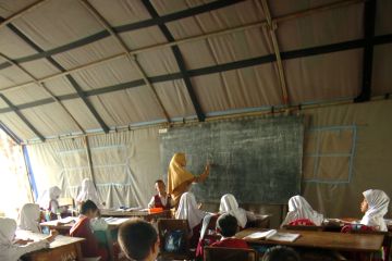 Sejumlah siswa mengikuti kegiatan belajar mengajar di tenda darurat di SDN 02 Desa Selapura, Kabupaten Tegal, Jawa Tengah, Senin (25/3/2019). Siswa kelas dua dan tiga sekolah tersebut terpaksa belajar di tenda darurat selama tiga bulan terakhir sejak ruangannya ambruk terkena puting beliung dan hingga saat ini belum ada bantuan dari pemerintah setempat. ANTARA FOTO/Oky Lukmansyah/foc.