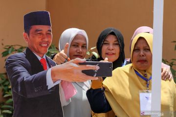 Sejumlah kaum perempuan pendukung calon presiden nomor urut 01 Joko Widodo – Ma’ruf Amin berfoto usai mengikuti kampanye terbuka Jokowi di Lhokseumawe, Aceh, Selasa (26/3/2019). Kampanye terbuka Jokowi dihadiri ribuan pendukung yang berasal dari berbagai parpol pengusung dan menyatakan siap memenangkan Jokowi-Amin pada Pemilu 2019. ANTARA FOTO/Rahmad/aww.