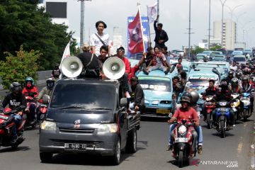 Sejumlah sopir angkutan kota melakukan konvoi saat berunjuk rasa di Makassar, Sulawesi Selatan, Selasa (26/3/2019). Mereka menuntut penurunan besarnya pajak kendaraan bermotor serta membebaskan biaya retribusi bagi angkutan kota di sejumlah terminal. ANTARA FOTO/Arnas Padda/aww.