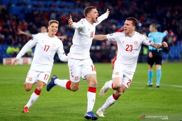Pesepk bola Denmark Henrik Dalsgaard (tengah) melakukan selebrasi setelah berhasil menyamakan kedudukan saat melawan Swiss dalam pertandingan Kualifikasi Piala Eropa 2020 Grup D, di Stadion St. Jakob-Park, Basel, Swiss, Selasa (26/3/2016). Swiss akhirnya harus puas dengan hasil imbang 3-3 setelah sebelumnya sempat unggul 3-0 dan berhasil disamakan oleh Denmark. ANTARA FOTO/Reuters- Arnd Wiegmann/hp.