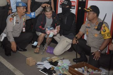 Petugas menunjukkan temuan barang bukti yang diduga terkait dengan transaksi narkoba milik narapidana Abdul Rahman Willy (kedua kiri) yang akan dipindahkan di Lapas Kerobokan, Bali, Rabu (27/3/2019). Sebanyak 10 orang narapidana kasus narkoba Lapas Kerobokan dipindahkan ke Lapas Nusakambangan untuk memberikan efek jera serta memutus mata rantai peredaran narkoba yang dilakukan dari dalam lapas. ANTARA FOTO/Fikri Yusuf/hp.