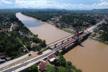 Sejumlah kendaraan melintasi Jembatan Sungai Dareh lama di samping Jembatan Sungai Dareh baru yang masih dalam proses pembangunan di Jalan Lintas Sumatera Sumbar-Jambi, Pulau Punjung, Dharmasraya, Sumatera Barat, Sabtu (30/3/2019). Pembangunan jembatan di atas Sungai Batanghari tersebut bertujuan memperlancar arus lalu lintas. ANTARA FOTO/Wahdi Septiawan/foc.