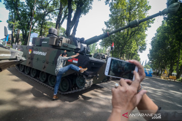 Pengunjung berfoto dengan Tank Harimau buatan PT Pindad saat pameran pengembangan industri pertahanan di Aula Barat Institut Teknologi Bandung (ITB), Jawa Barat, Selasa (2/4/2019). Pameran tersebut diikuti oleh industri pertahanan dalam negeri yang memajang aneka produk dan teknologi pertahanan terkini karya anak bangsa. ANTARA FOTO/Raisan Al Farisi/pras.