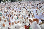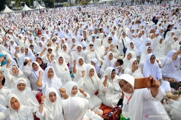 Umat muslim berzikir pada kegiatan Doa dan Zikir Akbar di halaman Istana Maimun Medan, Sumatera Utara, Rabu (3/4/2019). Zikir akbar tersebut digelar untuk memperingati Isra Mikraj Nabi Muhammad SAW 1440 H. ANTARA FOTO/Septianda Perdana/aww.