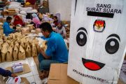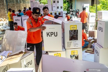 Petugas Panitia Pemilihan Kecamatan (PPK) mengepak logistik Pemilu 2019 di Gudang KPU Demak, Jawa Tengah, Rabu (3/4/2019). Logistik tersebut selanjutnya akan didistribusikan ke 3.615 TPS yang tersebar di 249 desa di wilayah Kabupaten Demak pada tanggal 16 April mendatang. ANTARA FOTO/Aji Styawan/aww.