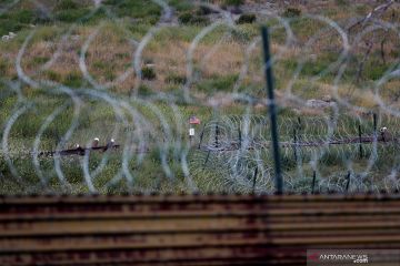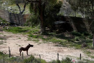 Seekor keledai berdiri di dekat pagar pembatas yang membatasi wilayah Amerika Serikat dan Meksiko terlihat dari Tecate, Meksiko, Kamis (4/4/2019) waktu setempat. ANTARA FOTO/REUTERS/Carlos Jasso/wsj.