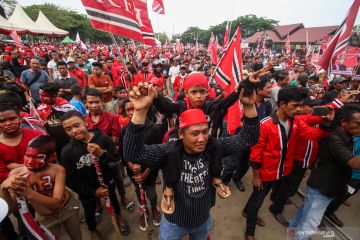 Massa pendukung Partai Aceh (PA) mendengarkan orasi politik saat kampanye akbar Partai Aceh di lapangan Hiraq, Lhokseumawe, Aceh, Minggu (7/4/2019). Kampanye PA yang dirintis para kombatan Gerakan Aceh Merdeka (GAM) tersebut diwarnai pengibaran bendera Bulan Bintang dan para kombatan optimis memperoleh kursi 50 persen plus satu atau 41 kursi dari 81 kursi DPRA dan siap memenangkan pasangan Capres 02 Prabowo-Sandi pada Pemilu 2019. ANTARA FOTO/Rahmad/ama.