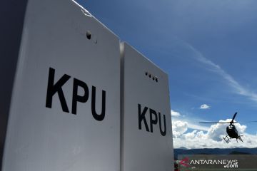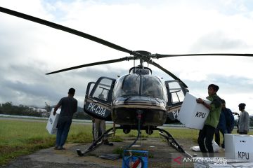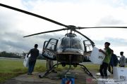 Helikopter yang membawa logistik Pemilu 2019 yang akan dikirim ke distrik-distrik lepas landas di Bandara Wamena, Jayawijaya, Papua, Sabtu (13/4/2019). Logistik Pemilu 2019 tersebut didistribusikan lewat udara dengan menggunakan helikopter ke kabupaten Yalimo yakni di distrik Welare dan Benawa. ANTARA FOTO/Yusran Uccang/aww.