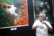 Penyanyi dan pencipta lagu Iwan Fals menjelaskan sejumlah lukisan hasil karyanya saat pembukaan pameran di Galeri Suara Hati, Depok, Jawa Barat, Senin (15/4/2019). Pameran seni lukis yang bertajuk Rosana tersebut menampilkan 50 lukisan karya dari penyanyi bernama asli Virgiawan Listanto tersebut. ANTARA FOTO/Yulius Satria Wijaya/hp.