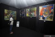 Pengunjung mengamati sejumlah lukisan karya penyanyi dan pencipta lagu Iwan Fals saat pembukaan pameran di Galeri Suara Hati, Depok, Jawa Barat, Senin (15/4/2019). Pameran seni lukis yang bertajuk Rosana tersebut menampilkan 50 lukisan karya dari penyanyi bernama asli Virgiawan Listanto tersebut. ANTARA FOTO/Yulius Satria Wijaya/hp.