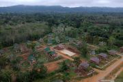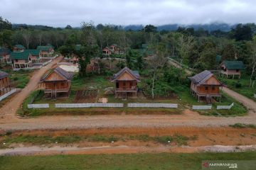 Foto udara kawasan terpadu Suku Anak Dalam (SAD) atau Orang Rimba Jambi di Lubuk Jering, Air Hitam, Sarolangun, Jambi, Rabu (17/4/2019). Pembangunan kawasan terpadu di desa penyangga Taman Nasional Bukit Dua Belas (TNBD) yang dihuni 57 kepala keluarga (KK) warga SAD tersebut bagian dari upaya pemberdayaan masyarakat adat melalui permukiman berbasis destinasi wisata namun dengan tetap mengedepankan kearifan lokal. ANTARA FOTO/Wahdi Septiawan/pras.