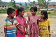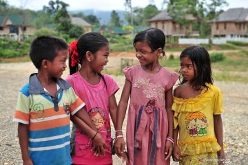 Anak-anak Suku Anak Dalam (SAD) bermain di kawasan terpadu Suku Anak Dalam, Lubuk Jering, Air Hitam, Sarolangun, Jambi, Rabu (17/4/2019). Pembangunan kawasan terpadu di desa penyangga Taman Nasional Bukit Dua Belas (TNBD) yang dihuni 57 kepala keluarga (KK) warga SAD tersebut bagian dari upaya pemberdayaan masyarakat adat melalui permukiman berbasis destinasi wisata namun dengan tetap mengedepankan kearifan lokal. ANTARA FOTO/Wahdi Septiawan/pras.