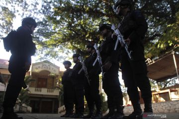Sejumlah anggota Gegana Brimod Belu sedang mengelar apel sebelum mensterilkan gereja Katedral Belu, Santa Maria Immaculata, Atambua, kabupaten Belu,NTT Kamis (18/4/2019). Sterilisasi yang dilakukan jelang misa Malam Kamis Putih itu dilakukan untuk memberikan rasa aman bagi umat Katolik yang akan mengelar ibadah. ANTARA FOTO/Kornelis Kaha/hp.