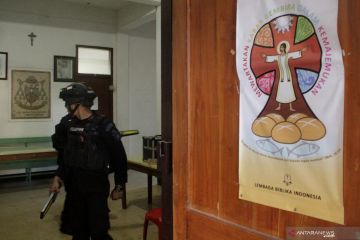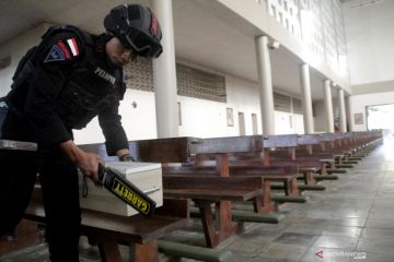 Anggota Gegana Brimod Belu mengunakan detektor untuk mensterilkan gereja Katedral Belu, Santa Maria Immaculata, Atambua, kabupaten Belu,NTT Kamis (18/4/2019). Sterilisasi yang dilakukan jelang misa Malam Kamis Putih itu dilakukan untuk memberikan rasa aman bagi umat Katolik yang akan mengelar ibadah. ANTARA FOTO/Kornelis Kaha/hp.