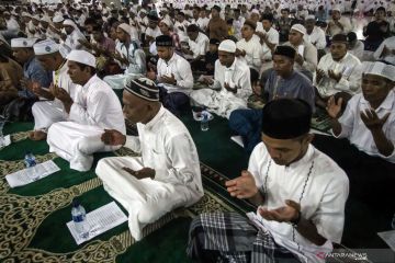 Umat muslim mengikuti zikir akbar di Masjid Agung Almarkazul Islamic, Lhokseumawe, Aceh, Kamis (18/4/2019) malam. Zikir akbar yang dipimpin Abi Zulkifli Alumni Ulumuddiah Abuya Syeeh Abdulssalam Ghaliby Abdya bertema “Tanpa Air Ikan Mati, Tanpa Zikir Hati Mati” itu digelar untuk menyambut datangnya bulan suci Ramadan 1440 H di Aceh. ANTARA FOTO/Rahmad/wsj.